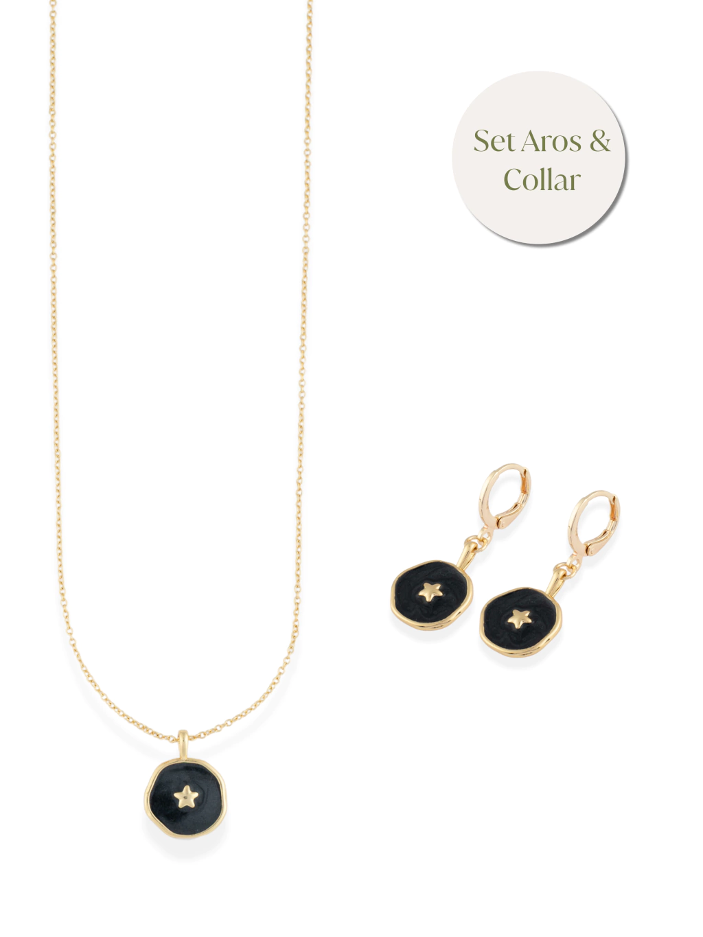 Set de aros y collar. Collar con cadena de eslabón fino con dije circular negro esmaltado y estrella en el centro. Par de aros con dije circular negro esmaltado y centro de estrella.