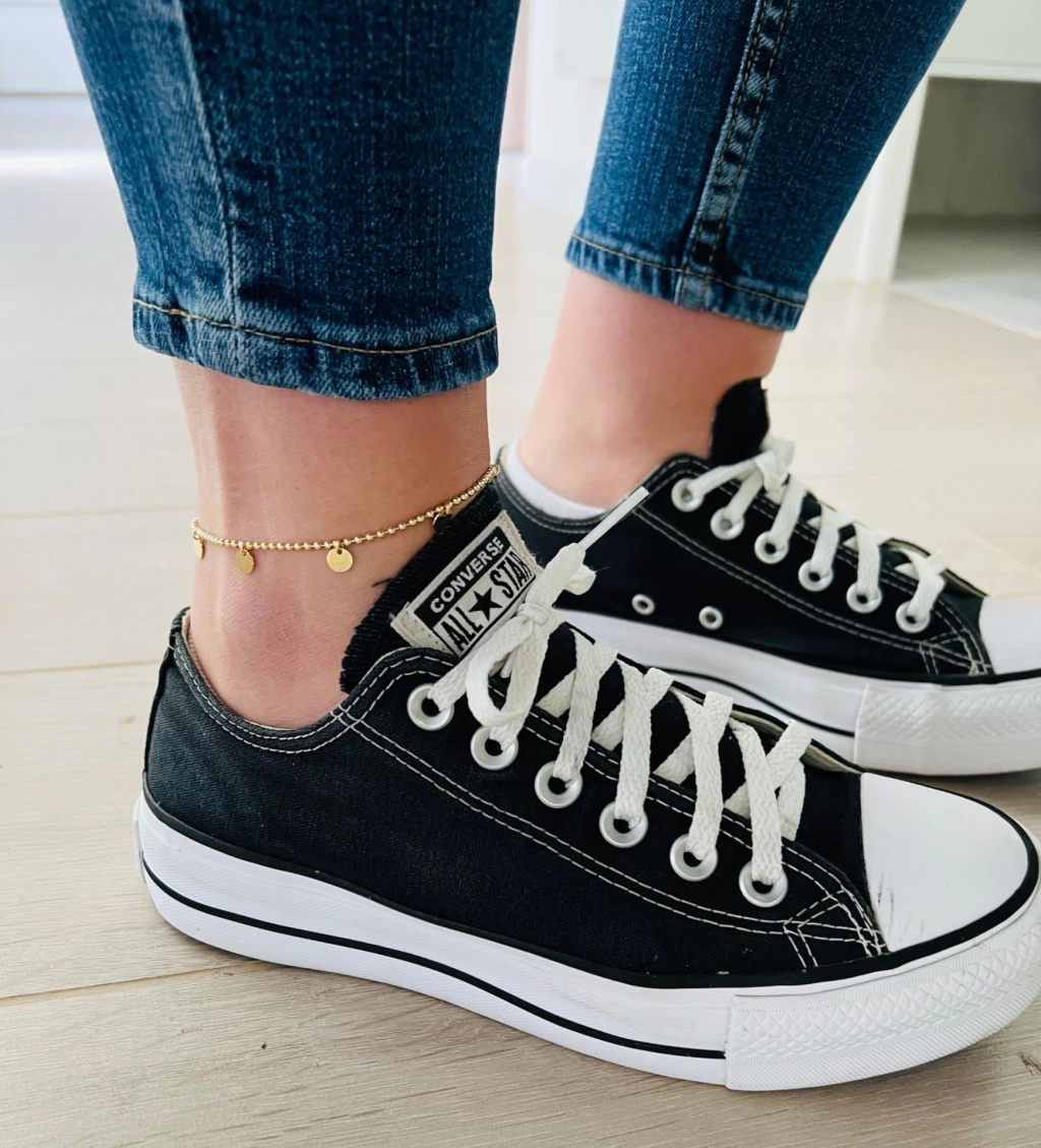 Tobillera de oro laminado Goldfilled. Hecho con cadena estilo militar de 22 cm de largo (más 2 cm de alargue) y discos planos.